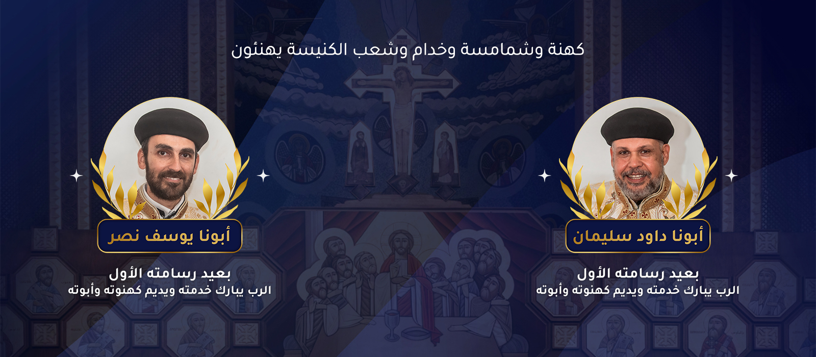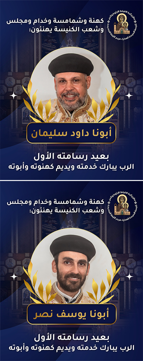 بنعمة وبركة ربنا وبصلوات ابينا الطوباوي المكرم البابا تاوضروس الثانى وبيد نيافة الحبر الجليل الانبا إكليمندس الأسقف العام لكنائس قطاع الماظة ومدينة الأمل وشرق مدينة نصر تم يوم السبت الموافق ٦ / ١٢ / ٢٠٢٥ ترقيه وسيامة كلا من م. صفائى أنيس وأ. جمال إسحق لرتبة الدياكونية وأيضاً ترقية ٣٣ ابصالتس لرتبة الأغنس...